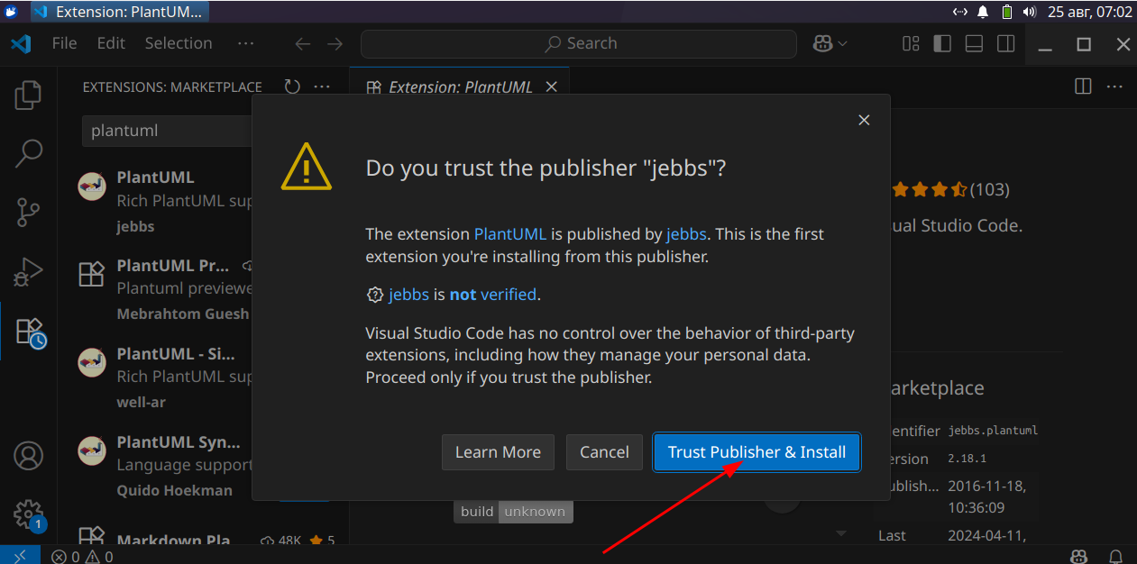 Во время установки могут спросить, доверяем ли автору плагина — говорим да: