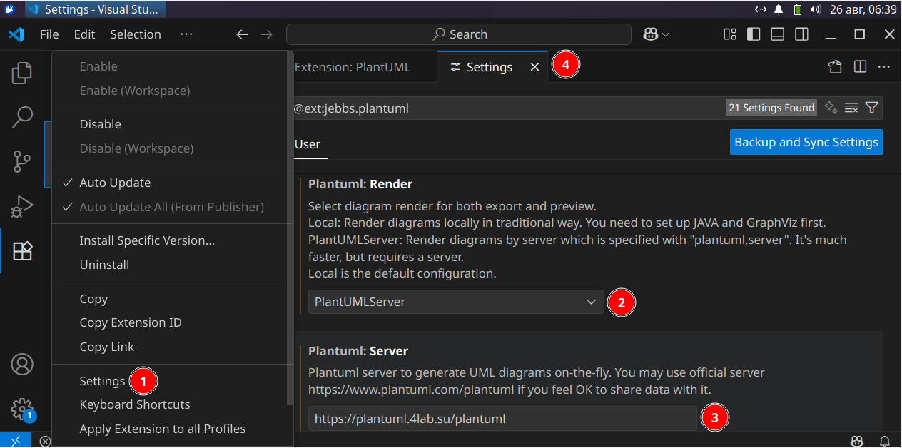 - В текстовом окне настройки «Plantuml: Server» вбейте адрес сервера: https://www.plantuml.com/plantuml (я использую свой личный https://plantuml.4lab.su/plantuml).