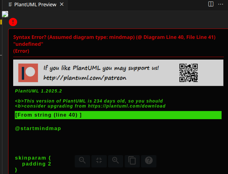 К сожалению, отладка и поиск ошибок plantuml может стать болью — главным образом потому, что описание ошибки представляется в виде картинки (сразу после красной надписи на первом скрине), которую нельзя даже скопировать. Усугубляется всё еще тем, что эта картинка зачастую получается обрезанной. Попробуйте отменить последнее действие при редактировании или проверьте, что после звездочек не забыли поставить пробел или попросите deepseek проверить синтаксис.